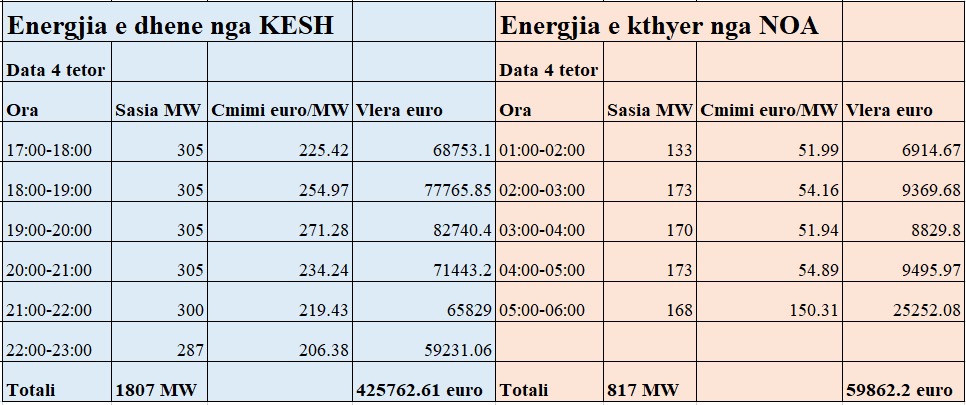 Në 4 tetor 2021, një ditë pas deklaratës së kryeministrit Edi Rama, nga ora 17 deri në orën 23 të mbrëmjes, KESH i ka dhënë kompanisë NOA Energy, saktësisht 1807 megavat energji. Siç tregohet nga tabela në foto, energjia është dorëzuar e gjitha në periudhën pik, ku çmimi në bursën hungareze për ato orë në atë datë ka variuar nga 206 deri në 271 euro për megavat. Në të njëjtën ditë, NOA i ka kthyer KESH-it mbrapsht 817 mega vat energji, por kthimi i energjisë është bërë nga ora 1 e natës deri në 6 të mëngjesit. Në orët që NOA i ka kthyer energjinë KESH-it, çmimi në bursë në atë datë ka variuar nga 50 deri në 150 euro për mega.