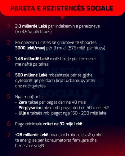 Kryeministri Edi Rama ka publikuar mëngjesin e sotëm në rrjetet sociale 7 masat e paketës së rezistencës sociale.