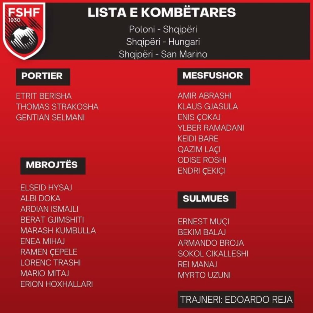Trajneri i Kombëtares, Edi Reja, ka bërë publike listën e futbollistëve të grumbulluar, për 3 ndeshjet që do të zhvillohen në muajin shtator, transfertën polake dhe dy ndeshjet në Elbasan ndaj Hungarisë dhe San Marinos.