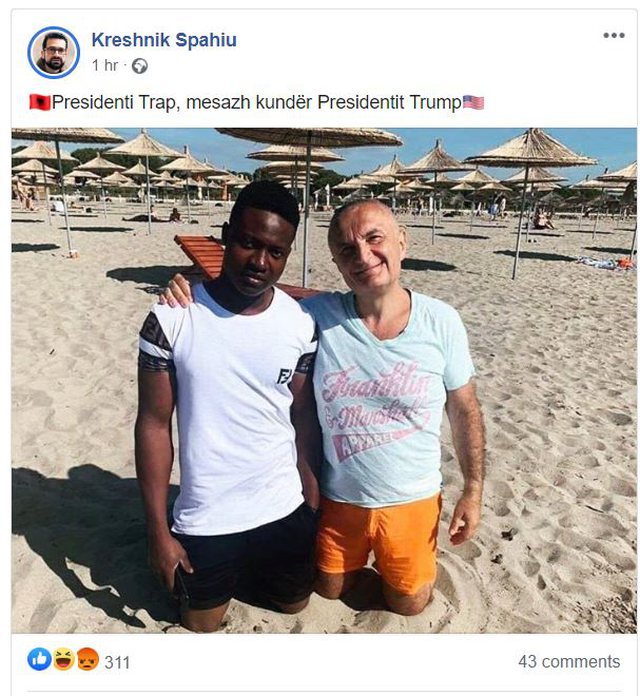 Presidenti Ilir Meta publikoi sot një foto nga bregdeti, krah Frensis, një person me ngjyrë, ku shkruante se “Me Frensis, e diela është edhe më e bukur”.