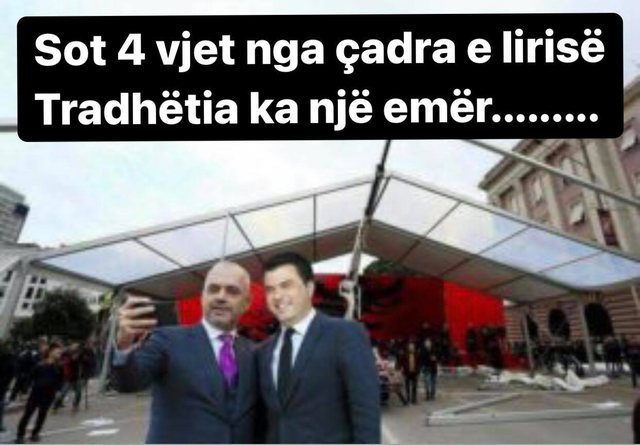 Sot Spahiu shkruan se bëhen 4 vite nga ‘Çadra e lirisë’. Ai ka publikuar foton montazh para çadrës ku shfaqet kryedemokrati Basha dhe Kryeministri Edi Rama duke u përqafuar.