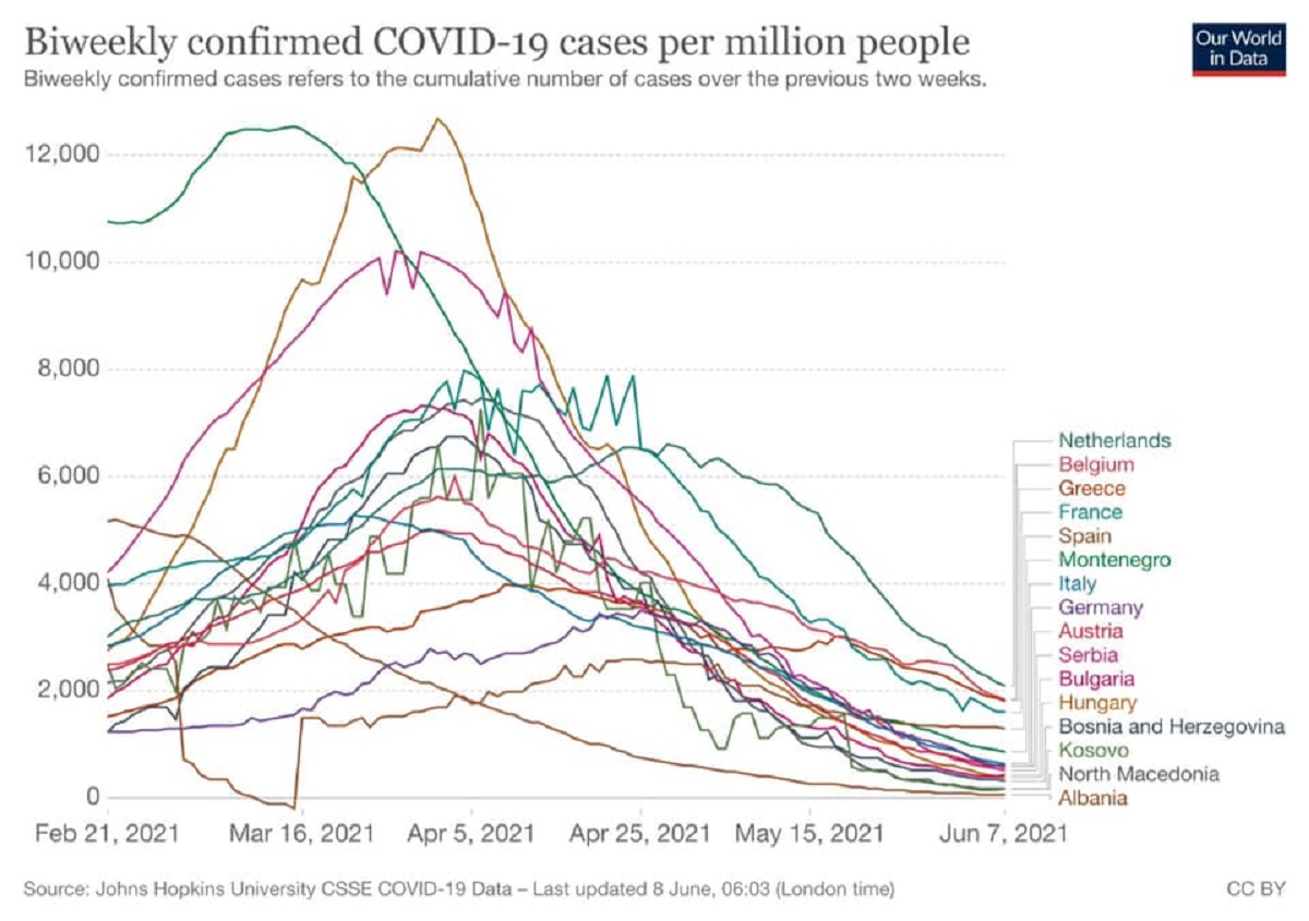 Në këtë grafik, rezulton se në vendin tonë ka pasur ulje të rasteve dhe më pak vdekje nga koronavirusi.