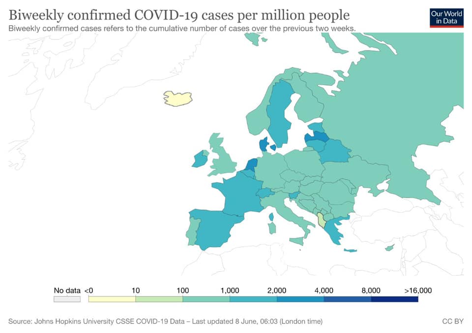 Kryeministri Edi Rama ka publikuar këtë paradite një grafik, sipas të cilit rezulton se Shqipëria dhe Islanda janë vendet me më pak infektime nga Covidi në Europë.