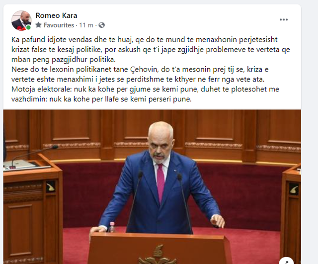 “Ka pafund idjote vendas dhe te huaj, qe do te mund te menaxhonin perjetesisht krizat false te kesaj politike, por askush qe t’i jape zgjidhje problemeve te verteta qe mban peng pazgjidhur politika.