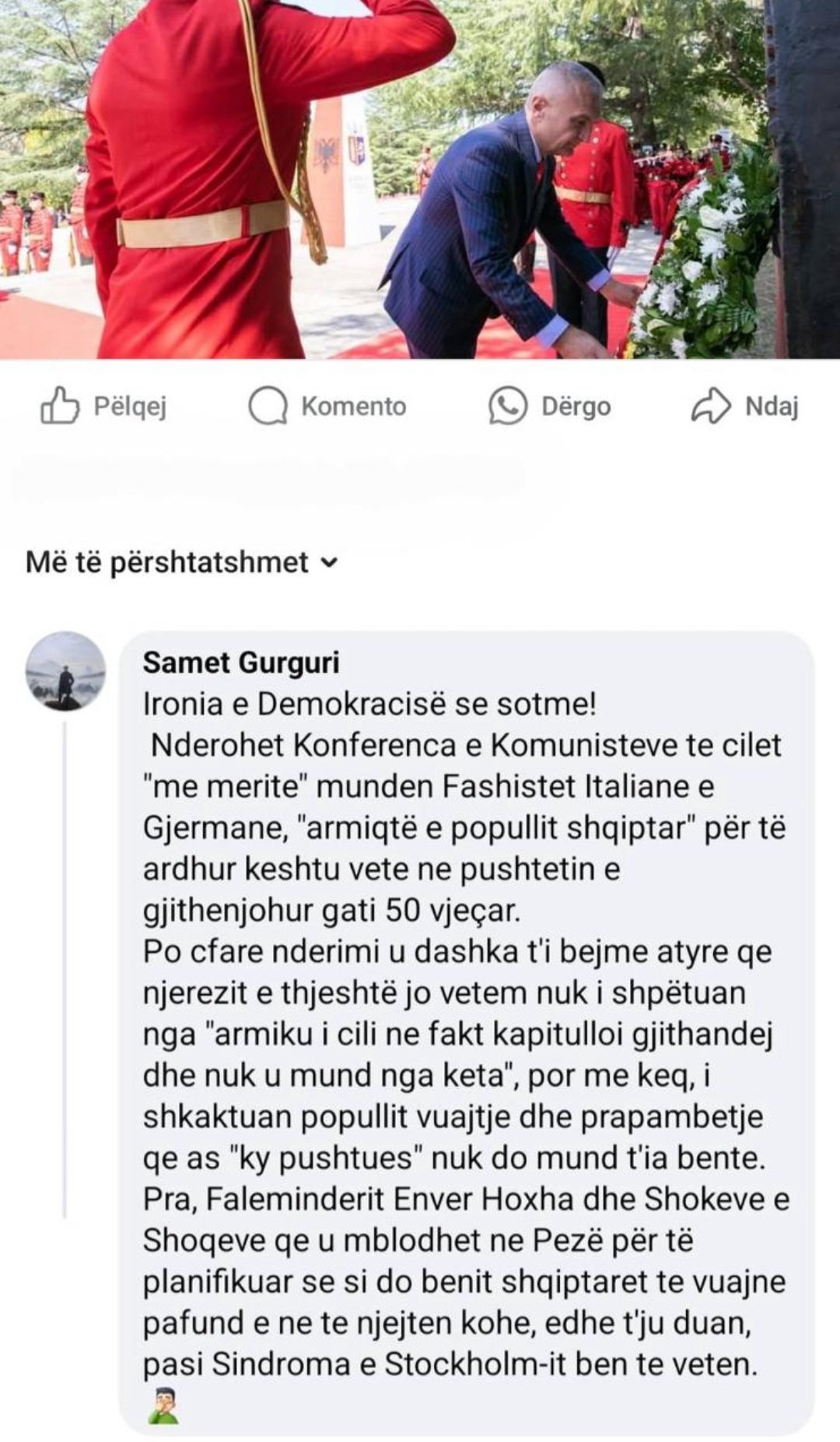 Vetë hetuesi shqiptar me emër turk shfaq një ndjenjë të hapur armiqësie për “komunizmin” që në gjenezë dhe për pinjollët e tij. Kjo tregohet në një koment replikues ndaj postimit publik që bën ish-presidenti Ilir Meta, në përvjetorin përkujtimor të ngjarjeve të Luftës së Pezës.