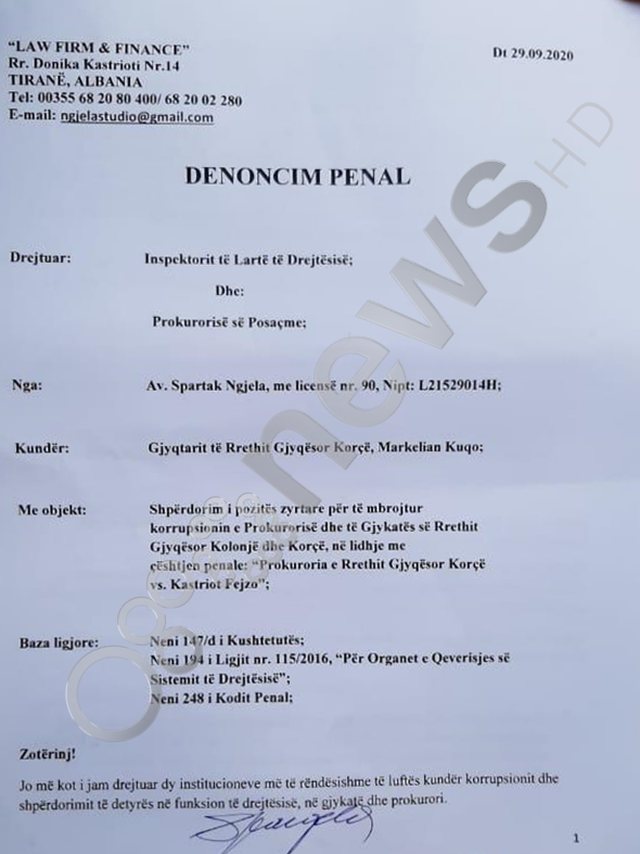 Avokati Spartak Ngjela kallëzon penalisht gjyqtarin e gjykatës së Apelit të Korçës, Markelian Kuqo. Ky i fundit ishte gjyqtari qe liroi me kusht Gert Gjinararin, i dënuar me b.urgim të përjetshem.