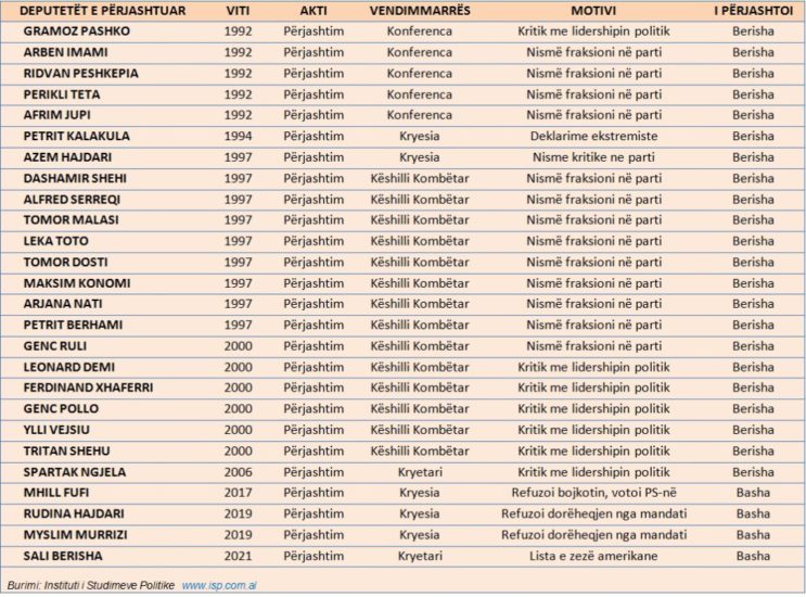 Një statistikë me të dhëna përpunuar nga Instituti i Studimeve Politike (ISP) paraqet listën e deputetëve të përjashtuar zyrtarisht nga grupi parlamentar ndër vite. Në krye të listës është deputeti Gramoz Pashko përjashtuar më 1992, pak muaj pas rotacionit politik, pas deklarimeve të tij kritike në media ndaj linjës zyrtare të PD. Në gusht 1992 u përjashtuan grupi i mocionistëve, në mesin e viteve ’90 u përjashtuan deputetët Kalakula (për një deklaratë politike) dhe Baleta (për qëndrimet politike).