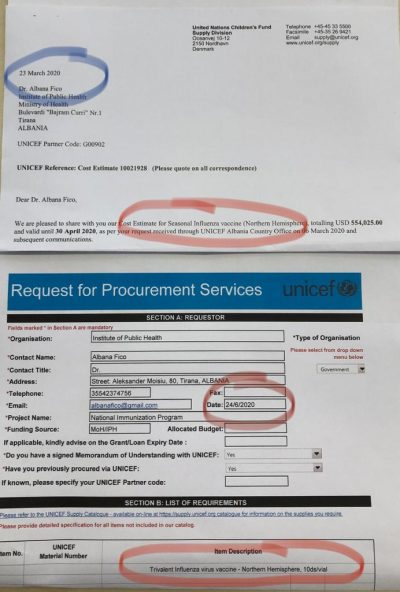 Ja dokumentet e porosisë së parë dhe të dytë të vaksinave kundër gripit të Ministrisë së Shëndetësisë, nëpërmjet Institutit të Shëndetit Publik me partnerët e UNICEF, që provojnë se porositë dhe blerjet e vaksinave janë bërë shumë përpara se të “zgjohej” nga gjumi lideri I opozitës.