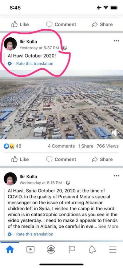“Al Hawl, Siri 20 tetor 2020 ne kohen e COVID. Ne cilesine e te derguarit te posacem te presidentit Meta per ceshtjen e kthimit te femijeve shqiptare te mbetur ne Siri, vizitova kampin ne fjale i cili eshte ne kushte katastrofike sic e shikoni ne video diten e djeshme.