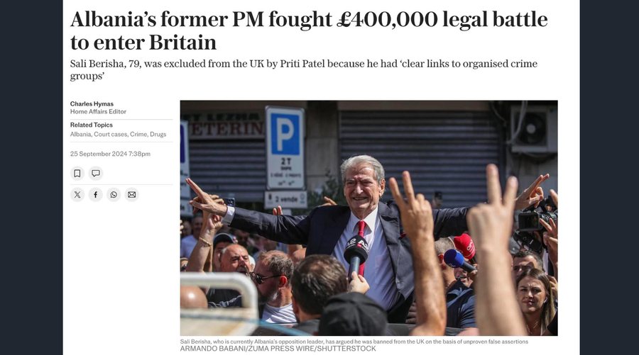 Ish-kryeministri i dyshuar për korrupsion i Shqipërisë ka shpenzuar më shumë se 500,000 paund për të luftuar një ndalim të qeverisë për hyrjen e tij në Britaninë e Madhe. Sali Berisha, i cili është paditur për korrupsion në Shqipëri, u përjashtua nga Britania e Madhe nga Priti Patel, sekretarja e atëhershme e Brendshme, mbi bazën se ai kishte “lidhje të qarta me grupet e krimit të organizuar dhe kriminelët” që përbënin një kërcënim për sigurinë publike në MB dhe Shqipëri.
