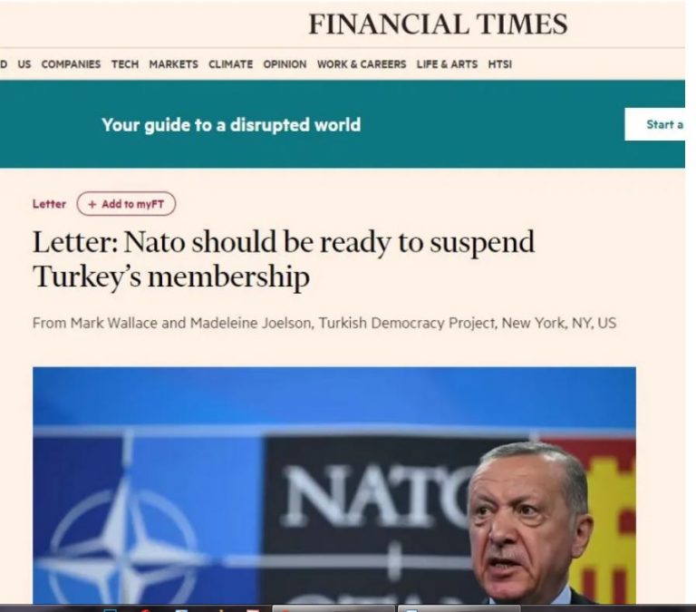 Letra e botuar në FT dhe e nënshkruar nga ish-ambasadori i SHBA-së në OKB Mark Wallace dhe Madeleine Joelson, dy zyrtarë të lartë në Programin e Demokracisë së Turqisë, i referohet ndër të tjera “Bazarisë së Madhe” të Turqisë në lidhje me pranimin e Suedisë dhe Finlandës në NATO dhe kritikon strategjinë e aleatëve, të cilët sipas tyre bënë kompromis me kërkesat e Rexhep Tajip Erdogan, për të hequr veton e tij, shkruajnë mediat greke.