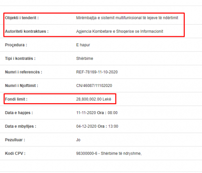 Kështu rezulton se ajo ka hapur një tender me objekt “Mirëmbajtja e sistemit multifunksional të lejeve të ndërtimit” dhe me numër reference REF-78169-11-10-2020.