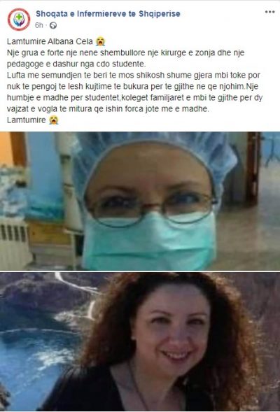 Nje humbje e madhe per studentet, koleget familjaret e mbi te gjithe per dy vajzat e vogla te mitura qe ishin forca jote me e madhe. Lamtumire” mbyllet mesazhi i shoqatës së Infermierëve të Shqipërisë.