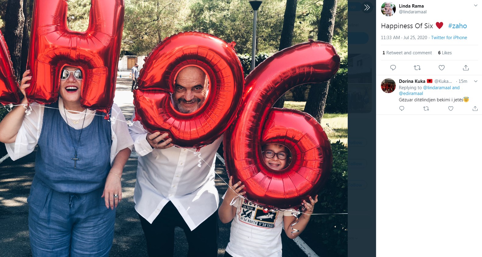 Edhe kryeministri Rama ka postu po të njëjtën foto në rrjetin social Twitter ku shkruan Happiness Of Six #zaho.