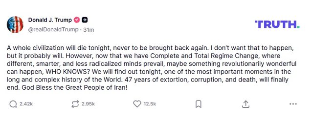 “Në një qytetërim i tërë do të vdesë sonte, për të mos u rikthyer më kurrë”, shkroi Trump, duke shtuar më pas se “ndoshta diçka e mrekullueshme në mënyrë revolucionare mund të ndodhë”.