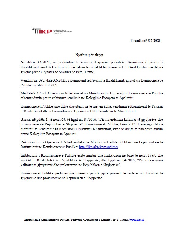 Komisioneri Publik pritet që të ankimojë në KPA vendimin e KPK për Gerd Hoxhën, gjyqtar pranë Gjykatës së Shkallës së Parë, Tiranë.