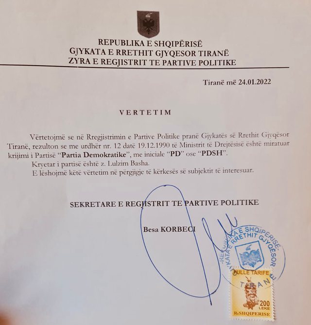 Pas kërkesës së kreut të KQZ-së, Ilirjan Celibashi, Lulzim Basha ka dërguar vërtetimin e Gjykatës se ai është kryetar i PD-së.