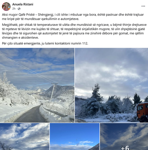 Kryetarja e komanduar e Bashkisë së Tiranës, Anuela Ristani, ka njoftuar përmes një postimi se aksi rrugor Qafë Priskë – Shëngjergj, i cili ishte i mbuluar nga bora, është pastruar dhe trajtuar me kripë, duke mundësuar qarkullimin normal të automjeteve.