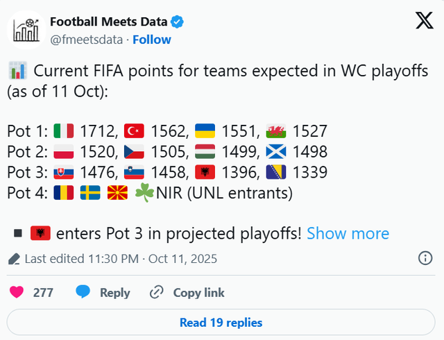 Vlen të theksohet se këto janë parashikime momentale, pasi situata mund të ndryshojë në muajin nëntor, pas ndeshjeve të fundit në kualifikuese.
