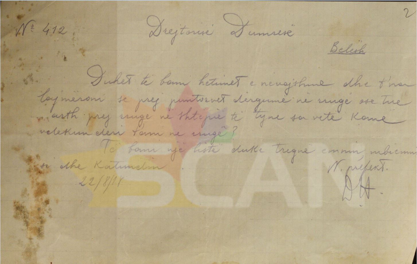 Shkresa e parë mban numrin 412 dhe i drejtohet drejtorisë së Dumresë në Belsh. Në këtë periudhë kishte pak muaj që bota ishte përfshirë nga pandemia (shpërtheu në shkurt 1918).