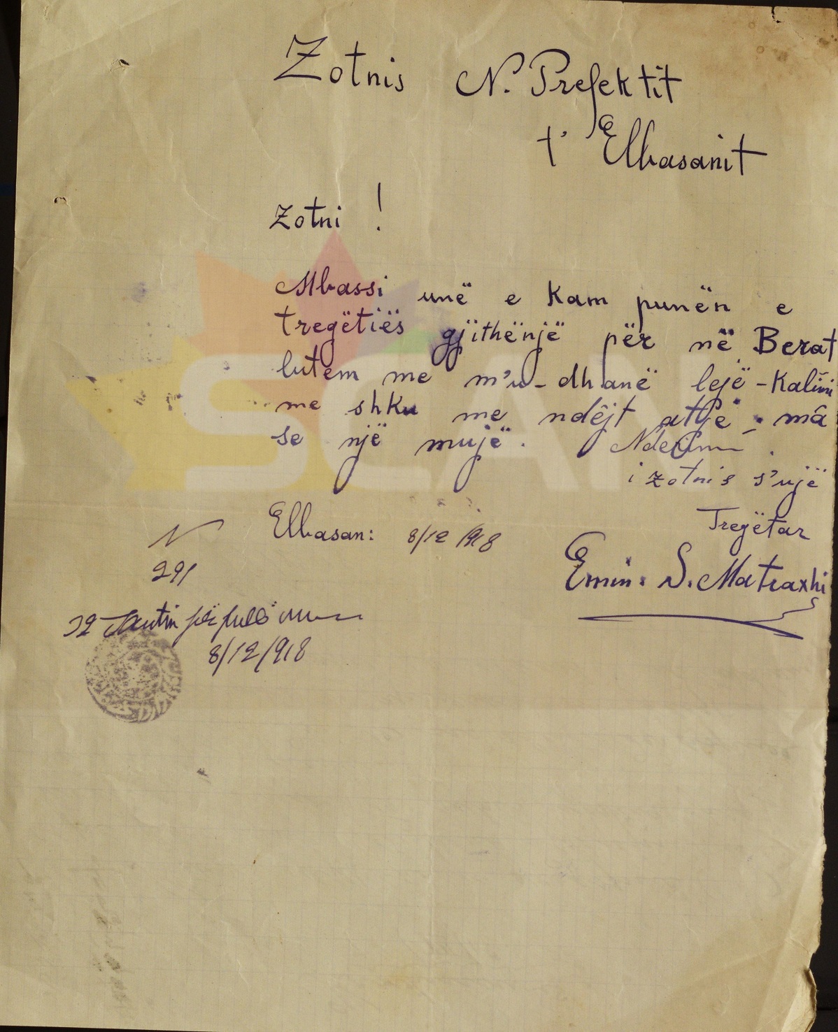 Një shkresë tjetër është ajo e datës 8 dhjetor 1918 që mban firmën e Emin S.Matraxhiut në Elbasan drejtuar nënprefekturës ku i kërkon leje lëvizje nga Elbasani në Berat. Në letër drejtuar nënprefektit, Matraxhiu shkruan se kërkon të shkojë në Berat e të qendrojë aty për më shumë se një muaj për arsye tregtie.