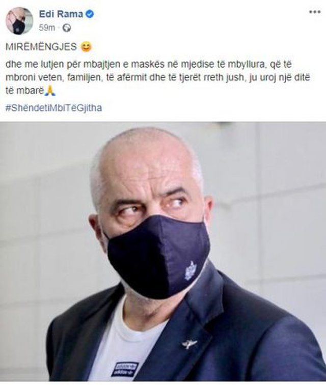 Kryeministri Edi Rama sërish ka bërë apel për mbajtjen e maskës.Në një postim në profilin e tij në Facebook, Rama bën apel duke iu lutur qytetarëve për mbajtjen e maskës në ambjentet e mbyllura kjo për të mbrojtur vetem dhe të tjerët.