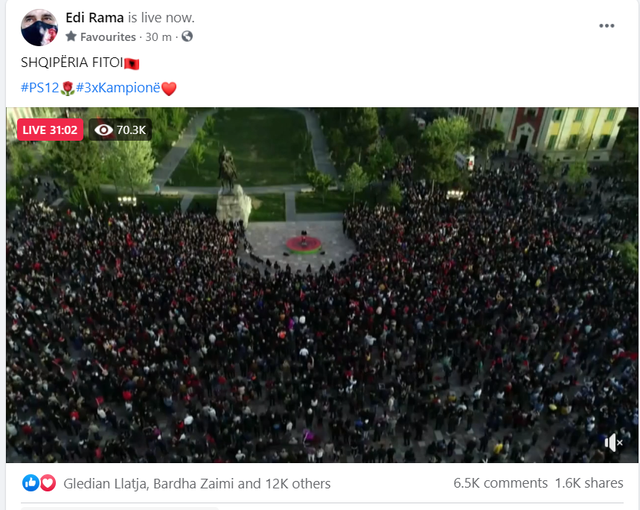 Ky fjalim i Ramës ka thyer rekord audience në Facebook. Rama po ndiqet live nga mbi 70 mijë persona.