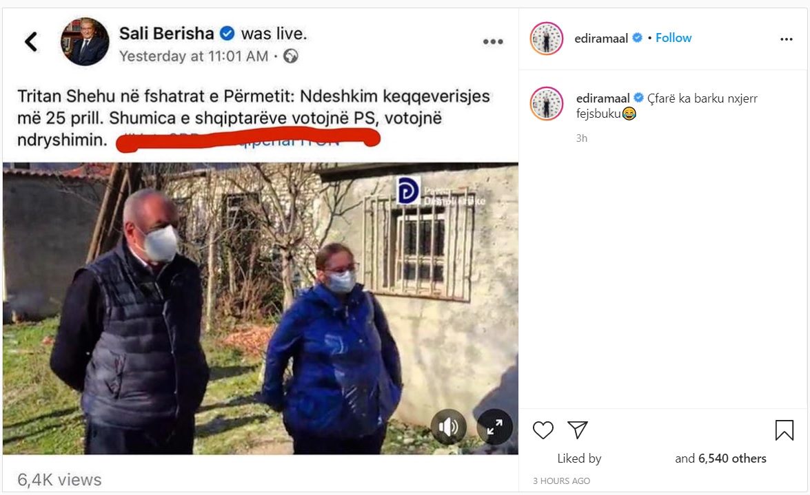 Ndërsa Rama në Instagram shkruan : “Çfarë ka barku nxjerr fejsbuku”, duke postuar foton postimit të Berishës në rrjetet sociale. Kjo duke huazuar shprehjen popullore shqiptar “çfarë ka barku e nxjerr bardhaku”.
