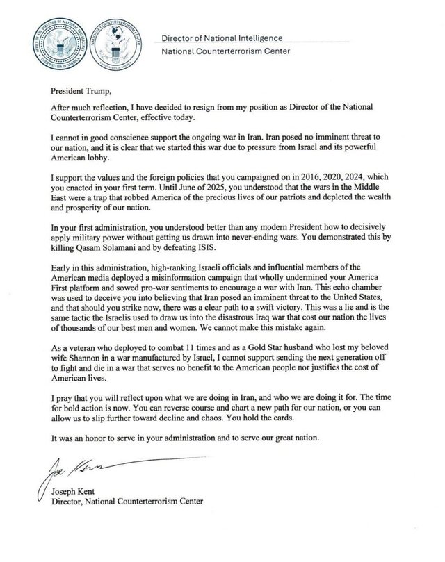 Drejtori iQendrës Kombëtare Kundër Terrorizmit në SHBA, Joe Kent, ka dhënë dorëheqjen, duke kundërshtuar hapur luftën e Shtetet e Bashkuara të Amerikës me Iran.