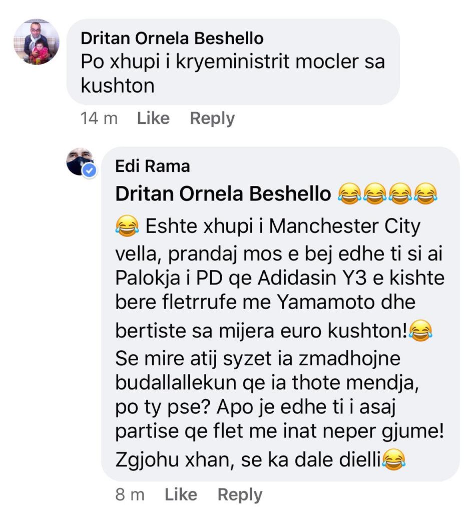Komentuesi e pyet Ramën sa i kushton xhupi mocler, por kryeministri i përgjigjet me ironi që xhupi është i Manchester City dhe i kërkon që të mos bëhet si Paloka i PD qe Adidasin Y3 e kishte bere fletrrufe me Yamamoto.