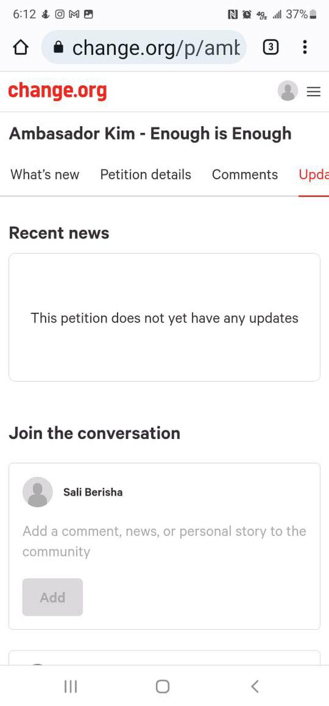 Dhe e kanë ndjekur plot të marrë, rreth 3 mijë, që mendojnë se mund ta largojnë ambasadoren Kim me peticione online, ndërkohë që Departamenti Amerikan i Shtetit është shprehur qartë se qendrimet e ambasadores nuk janë personale, por përfaqësojnë Uashingtonin zyrtar.