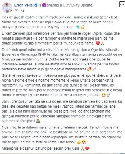 Gjatë këtyre dy javëve u miqësova me plot pacientë apo të shëruar të tjerë, njoha historitë e tyre e ndamë momente të kësaj lufte të përbashkët të njerëzimit. Ky komunitet, ku tani edhe unë duhet të bëj pjesën time, do duhet të jetë më aktiv për të ndërgjegjësuar të tjerët mbi seriozitetin e kësaj drame e nevojën për të bashkëpunuar me autoritetet çdo ditë! ??