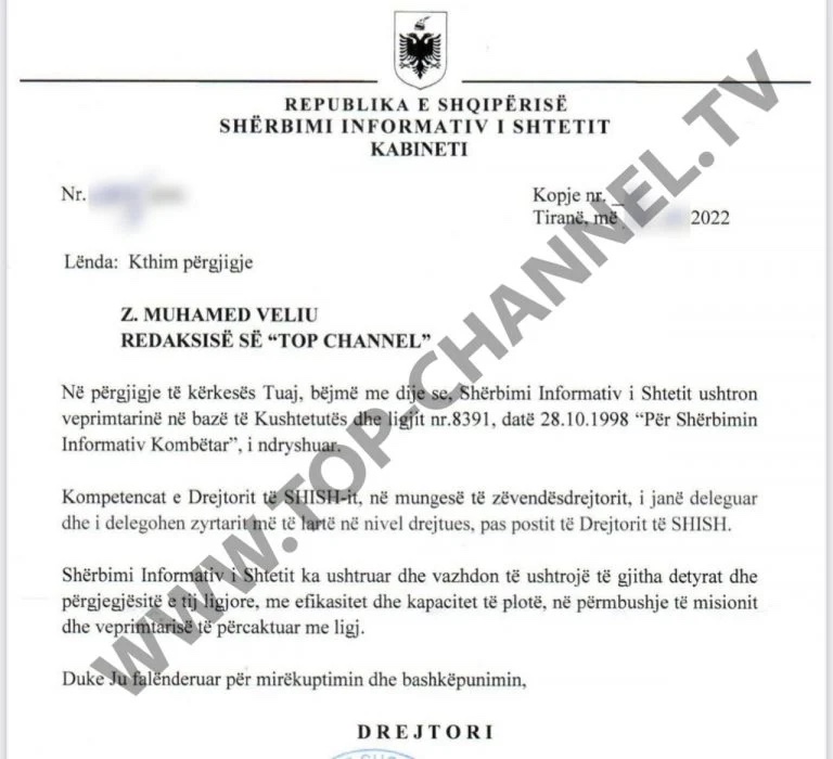 Në përgjigje thuhet: “Kompetencat e drejtorit të SHISH-it, në mungesë të zëvendës drejtorit i janë deleguar dhe i delegohen zyrtarit më të lartë në nivel drejtues, pas postit të drejtorit të SHISH. Shërbimi Informativ i Shtetit ka ushtruar dhe vazhdon të ushtrojë të gjitha detyrat dhe përgjegjësitë e tij ligjore, me efikasitet dhe kapacitet të plotë në përmbushje të misionit dhe veprimtarisë të përcaktuar me ligj”.