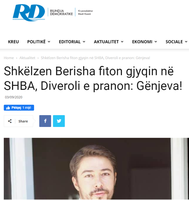 Organi zyrtar i saj, “Rilindja Demokratike”, ka publikuar reagimin e Shkëlzenit, me titullin: “Shkëlzen Berisha fiton gjyqin në SHBA, Diveroli e pranon: Gënjeva”.