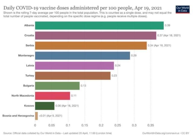 Sipas grafikut të realizuar nga “Our World in Data”, Shqipëria kryeson tabelën e sigurimit të numrit vaksinave të përllogaritur në bazë të popullsisë.