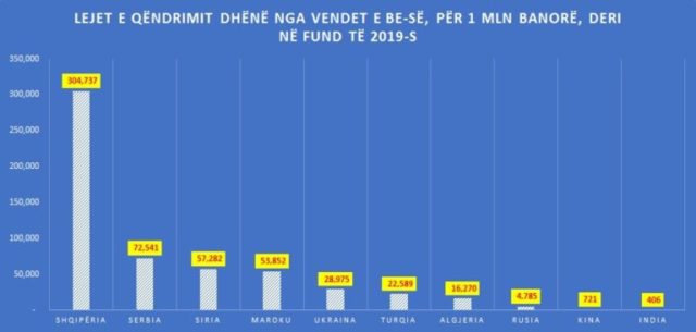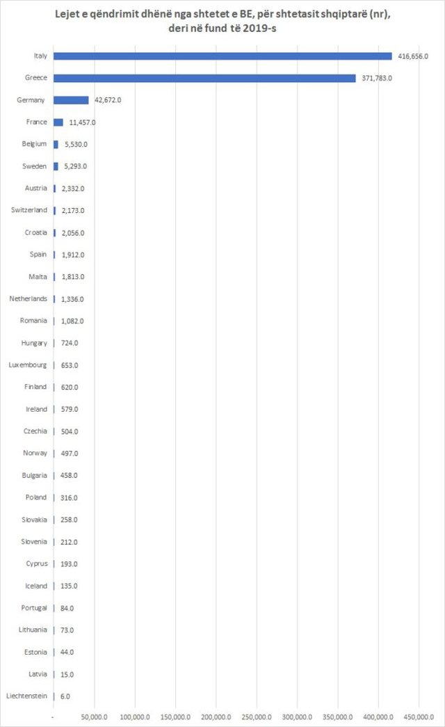 Sipas të dhënave të Eurostat, të përpunuara nga “Monitor”, për shtetasit shqiptarë, vendet e Bashkimit Europian kanë dhënë per Shqipërinë 304 mijë leje qëndrimi për 1 milion banorë, që është 4 herë më e lartë sesa shteti i dytë pas nesh, Serbia (shih grafikun: Lejet e qëndrimit dhënë nga vendet e BE-së, për 1 mln banorë, deri në fund të 2019-s).
