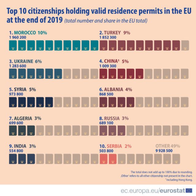 Sipas Eurostat, në fund të vitit 2019, qytetarët e Marokut ishin grupi më i madh që mbanin leje qëndrimi të vlefshme (2.0 milionë), ndjekur nga shtetasit e Turqisë (1.9 milionë), Ukrainës (1.3 milionë) dhe Kinës (përfshirë Hong Kongun; 1.0 milionë). Këto ishin shtetësitë e vetme që kishin më shumë se një milion leje qëndrimi të vlefshme.