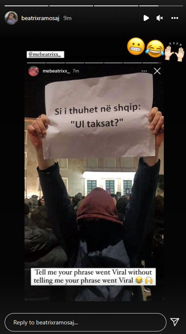 “Si i thuhet në shqip: Ul taksat”! Ajo e ka marrë me shumë sportivitet postimin duke e shoqëruar me disa emoji, një nga të cilë është një emoji duke qeshur.