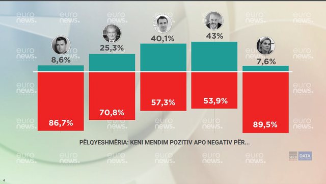 Për qytetarët e Tiranës, liderët politik që perceptohen më negativisht janë kryetarja e LSI, Monika Kryemadhi (89,5%) dhe Lulzim Basha (86,7%). 71% e qytetarëve të Tiranës kanë mendim negativ për ish kryeministrin Sali Berisha.
