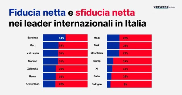 Qëndrimi i qeverisë spanjolle ndaj Shteteve të Bashkuara, politikat progresiste në fushën e punës dhe emigracionit, si dhe refuzimi për të rritur shpenzimet ushtarake pavarësisht kërcënimeve të Donald Trump, janë disa nga arsyet pse kryeministri spanjoll Pedro Sánchez gëzon nivelin më të lartë të besimit mes votuesve italianë. Pas kërcënimeve të tjera nga Uashingtoni për çështjen e bazave ushtarake në Andaluzia, qeveria spanjolle ka kundërshtuar gjithashtu në mënyrë të fortë operacionin ushtarak të SHBA-së dhe Izraelit kundër Iranit.