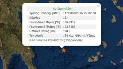 Lëkundje të forta raportohet se janë ndjerë në Hydra të Greqisë këtë të hënë. Sipas autoriteteve sizmologjike, tërmeti ka qenë me magnitudë 5.1. Epiqendra e lëkundjeve sizmike ishte ishulli Hydra në një thellësi 90 kilometra nëntokë.