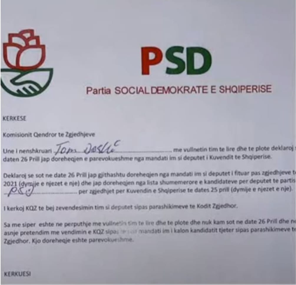 “Unë i nënshkruari Tom Doshi me vullnetin tim të lirë dhe të plotë deklaroj se në datën 26 prill jap dorëheqjen e parevokueshme nga mandati im si deputet i Kuvendit të Shqipërisë. Deklaroj se sot në datën 26 prill jap gjithashtu dorëheqjen nga mandati im si deputet i fituar pas zgjedhjeve të 25 prillit 2021 dhe jap dorëheqjen nga lista shumëemërore e kandidatëve për deputet të PSD për zgjedhjet për Kuvendin e Shqipërisë të datës 25 prill.