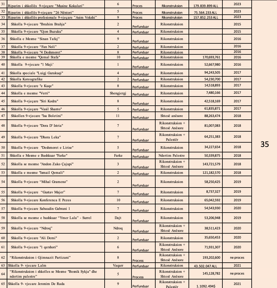 Tani ose nuk është ndërtuar asnjë shkollë e re… ose janë ndërtuar por jo me paratë e bashkisë, që edhe kjo, e thënë nga goja e tyre, është një gënjeshtër që nuk ka nevojë për tu verifikuar. Por dihet mirë se demokratët e Saliut dhe Belindit, nuk i kanë marrëdhëniet e mira me shkollat, sepse është e provuar që kandidati për Bashkinë Tiranë, z. Belind Këlliçi, ka gënjyer për përfundimin e ciklit të mesëm shkollor, për të cilin nga 5 vite në “Institutin Harry Fultz”, ka bërë vetëm 4 prej tyre, më pas për të përfunduar arsimin e lartë në SHBA. Në gjuhë tjetër mashtrimi i Këlliçit me arsimin në SHBA quhet krim federal. Nga ana tjetër, edhe ish kreu i Bashkisë Tiranë, Lulzim Basha, ish-kryetari 7×7=42, i ka pasur inat shkollat, pasi gjatë mandatit të tij 4 vjeçar jo që nuk ndërtoi asnjë shkollë të re, por edhe bojën e fasadës ia kurseu atyre.