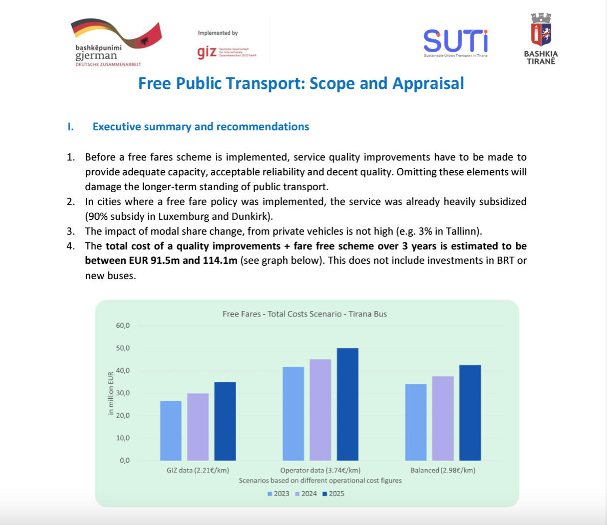 Fakt është se studimi i GIZ flet qartë, që transporti publik falas kushton shumë më shumë, se 16 milion euro që pretendon kandidati Këlliçi, që janë vetëm paratë për të subvencionuar biletat e udhëtarëve të autobuzave, e përdorur si grackë për të marrë dhjetra miliona euro të tjera nga buxheti për të realizuar në tërësi projektin. Për sa i përket studimit të GIZ nuk është imagjinat dhe ekziston në linkun mëposhtë.