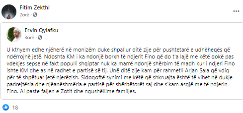 Këshilltari i Lulzim Bashës Fitim Zekthi ka përcjellë një reagim në rrjetin social Facebook ku kundërshtohet vendimi i qeverisë për të shpallur 29 marsin ditë zije kombëtare.