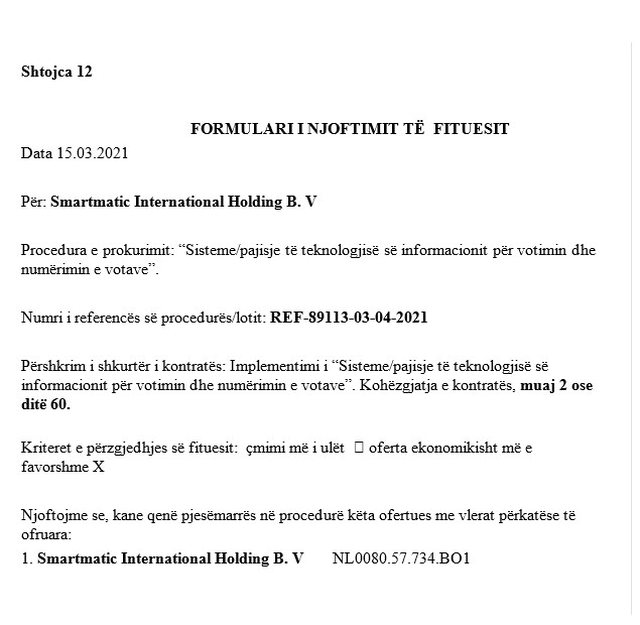 Sipas dokumenteve, procedura e këtij tenderi shikohet se ka qenë e tipit me negocim, pa njoftim. Në të ka marrë pjesë vetëm një kompani e cila natyrisht është shpallur edhe fituese. Holandezët e Smartmatic International Holding B.V. u shpallën fitues me vlerë të ofruar prej rreth 1.2 miliardë lekësh të vjetra me TVSH dhe se vlera fituese është mjaft pranë me vlerën e fondit limit, afro 90.4% e saj.