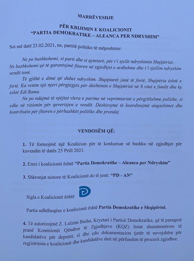 Në marrëveshje thuhet se “ne po bashkohemi, si parti dhe si qytetarë, për t’i sjellë ndryshimin Shqipërisë”.